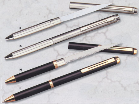 在携带和写字时它的外形跟普通的笔没什么两样。把笔帽打开套在笔的另一端,它就成了一把的小刀。用它来削水果、削铅笔、开信封、剪报等都很实用。