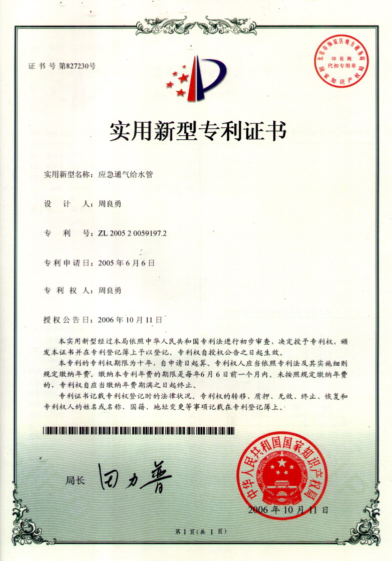 同样,在煤矿发生瓦斯突出事故时,应用本发明后,矿工就不会因瓦斯浓度过高窒息死亡。因此,本发明应急通气给水管可以说是被困矿工最后的救命管。