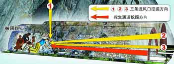 而在发生事故后,救援人员打这条导管既危险又困难重重,如果不在短时间内打通,里面的被困人员就有可能窒息或缺水而死。还有一点是:要先确定里面是否还有被困人员活着,如果不打导管就当然无法知道。