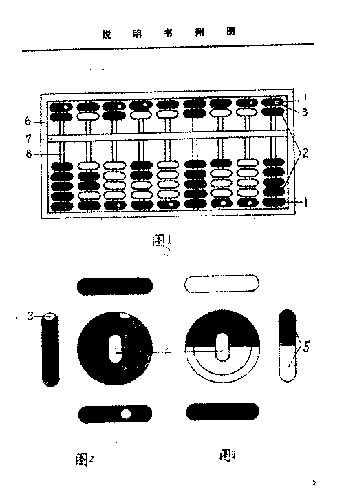 1、一种由珠子(1)(2)、框(6)、梁(7)、档(8)构成(可以带有清盘器)的算盘,其特征是在珠子(1)(2)的外表面上有两种颜色。